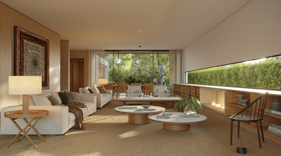 Inside, the residence unfolds as a sequence of light-filled, open spaces that blur the boundaries between interior and exterior. Expansive windows and sliding panels connect the home to its landscaped gardens, while five private bedroom suites and multiple gathering areas strike the balance between intimacy and openness.